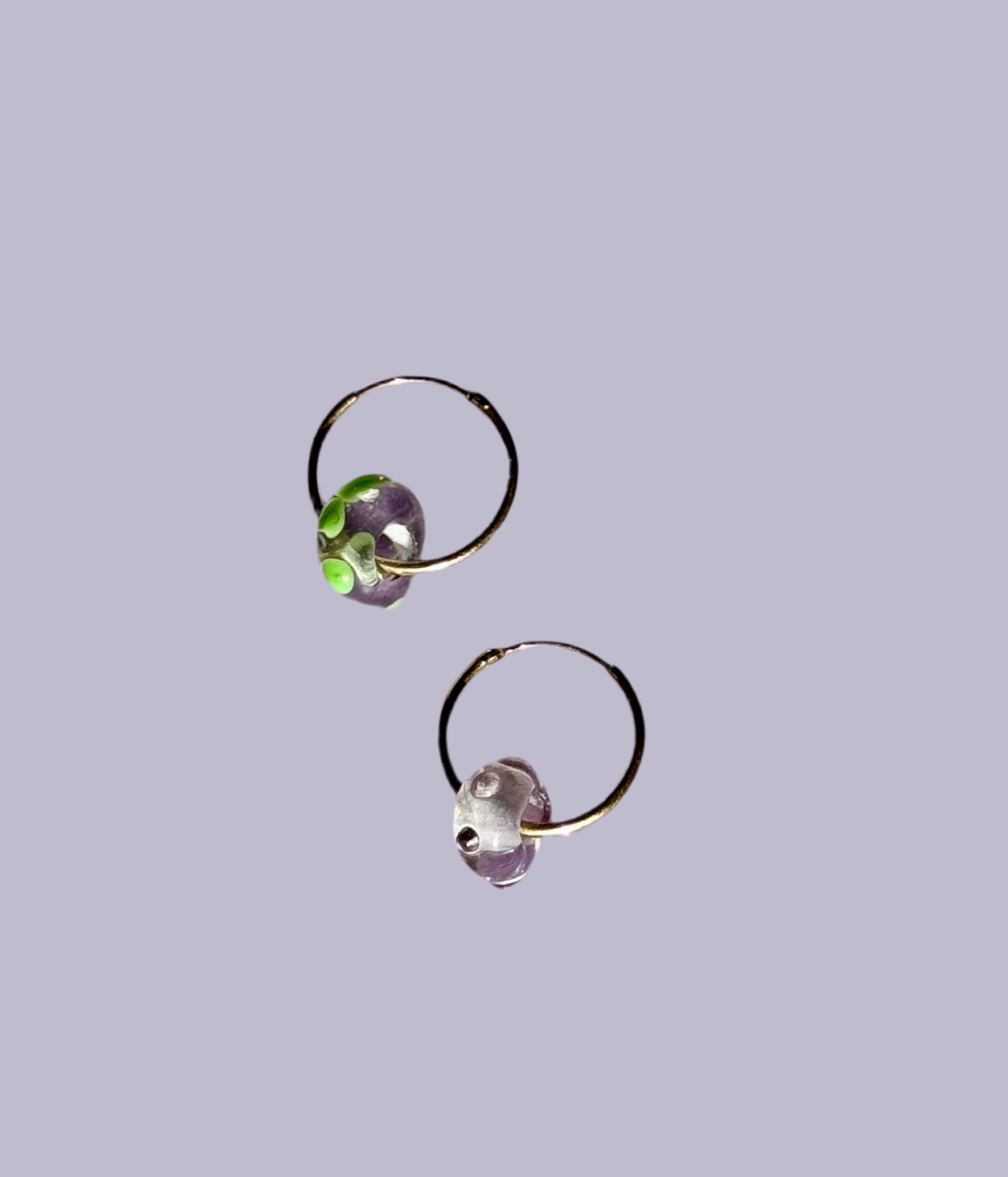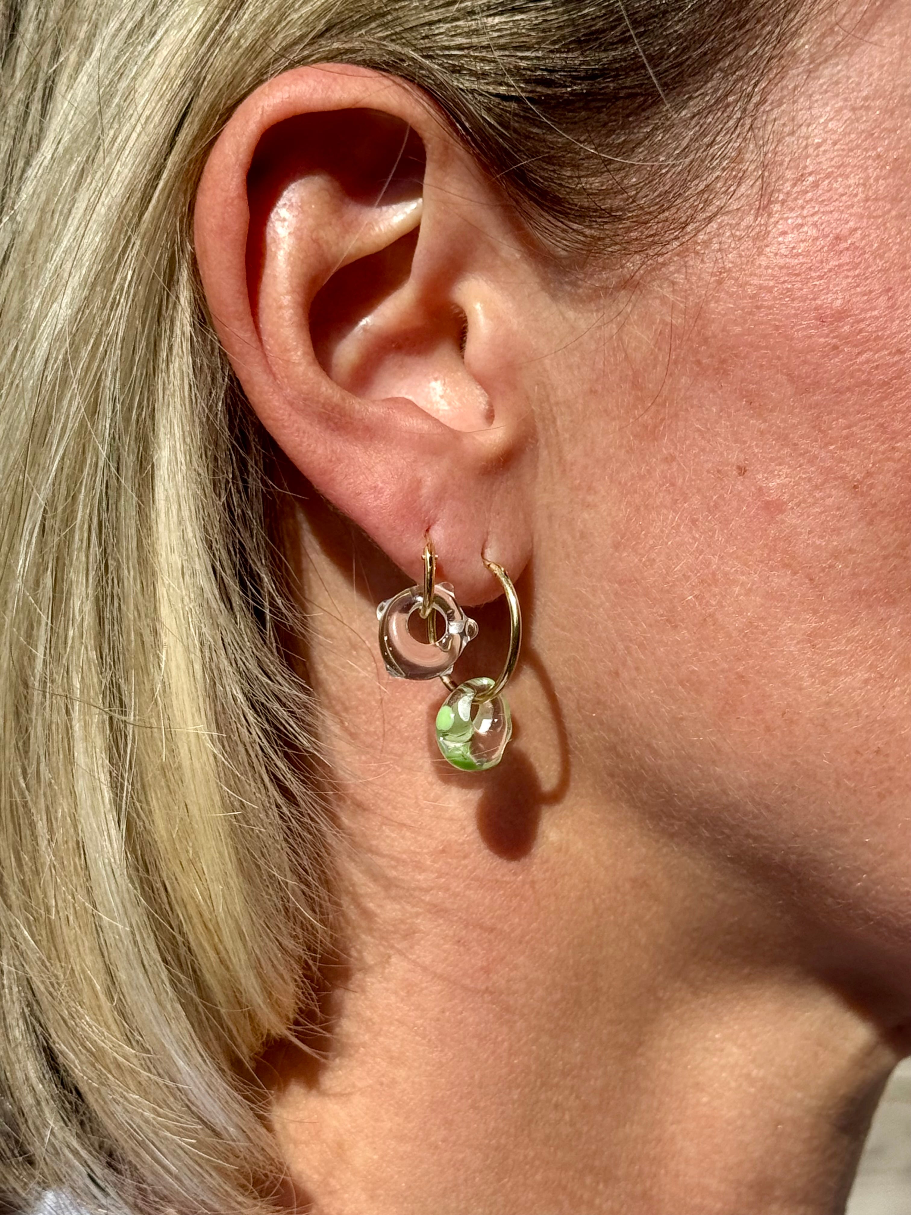 Handmade glass bead earrings with green and pink blobs.