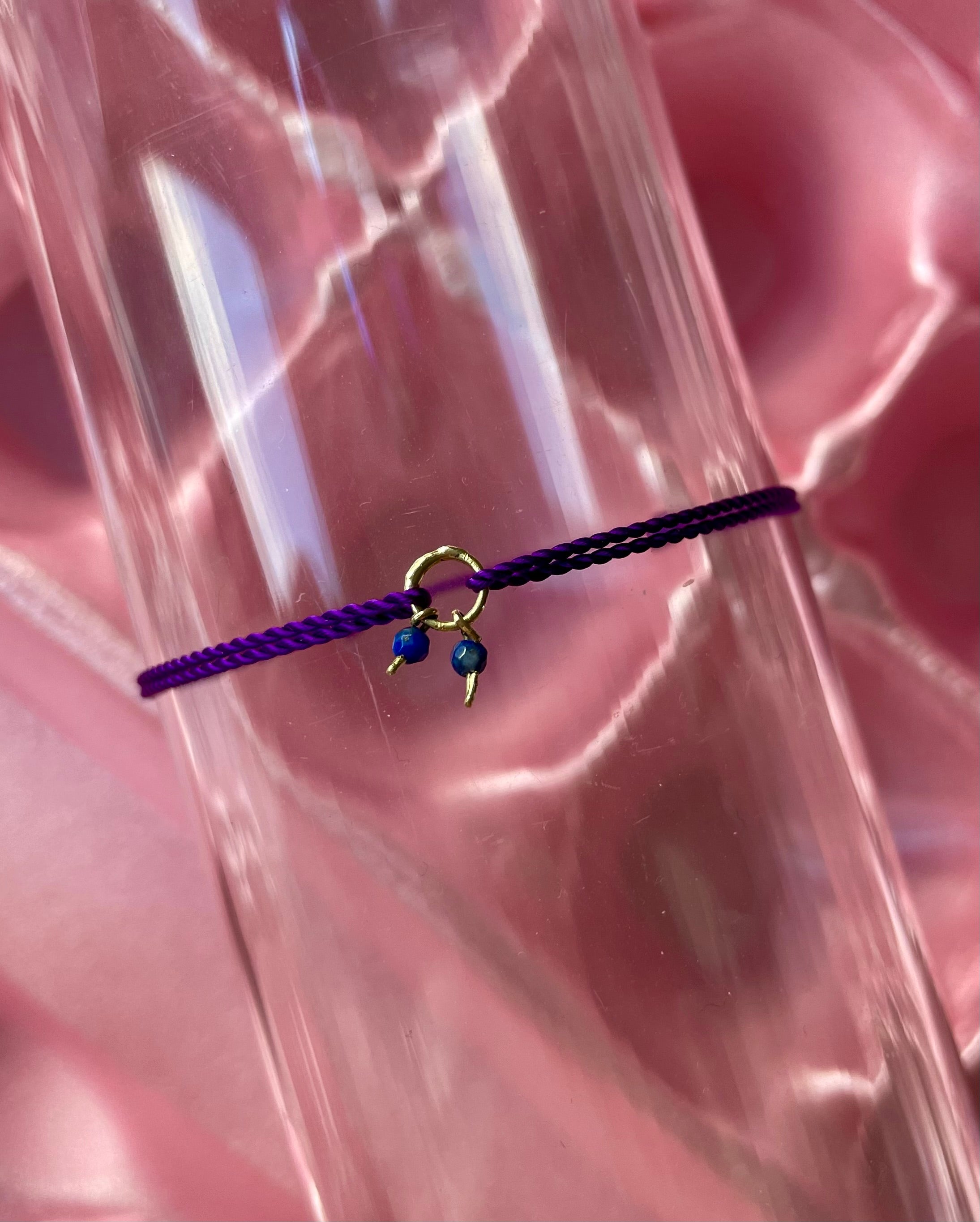 Lapis Lazuli with a touch of 14k hammered gold bracelet on a purple nylon thread. Size is adjustable