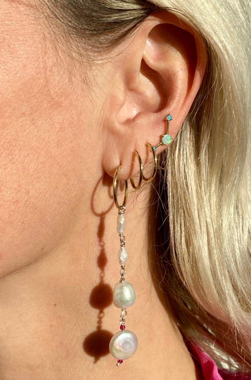 925 silver earring with pearls and rubies with a 14k golden hoop earring. Total Lenght: 8cm. One piece