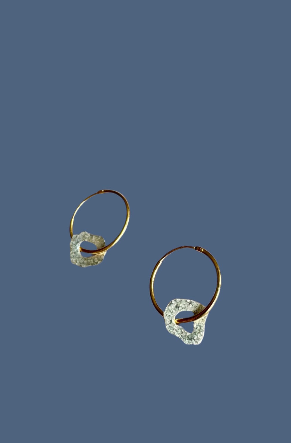 14k golden hoop earrings with 925 silver hammered mini shapes.
