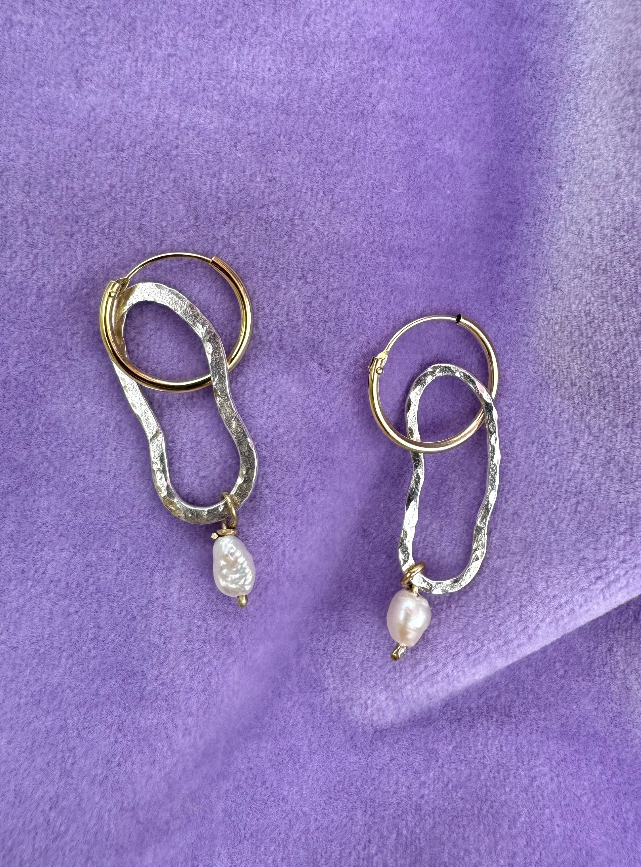 14k golden hoop earrings with 925 silver hammered shapes with a pearl with 14k golden wire. Total length 4,6 cm